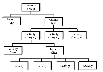 Activities, like agencies, are classified into up to five levels, as shown below. The Activity code (the lowest level in the hierarchy) is the level of detail used on transactions. Usually, only large entities or those having special reporting requirements need to use all levels in this hierarchy. Activities are agency specific, with unique meaning in each agency. An activity hierarchy is shown in Figure 15.