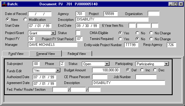 A project is established in the system by entering a five-character project number, unique within the agency. The overall project budget is established by entering the amount to be received from the various funding sources for the project as a whole. The Sub-Project and Phase codes for the project are entered as line items and have their own budgeted amounts which, added together, must equal the total project budget amount.