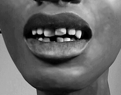 Teeth: Top 2 front teeth show discolored edges. One central bottom tooth broken off.
